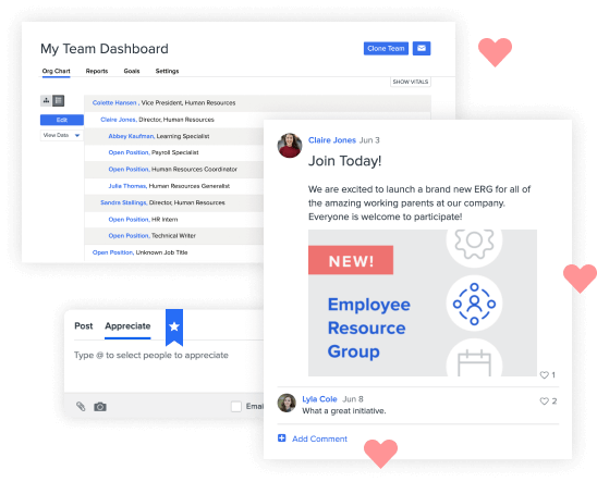 A flexible source of truth for your people data that’s easy to use–with a company newsfeed, company resource storage, employee directory, and more.