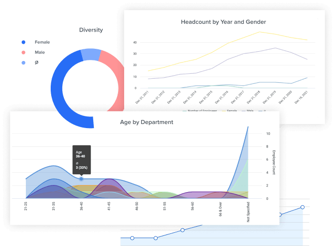 Analyzing your people data has never been so easy with an ad-hoc report builder and delivered dashboards for diversity, attrition, time, and more.